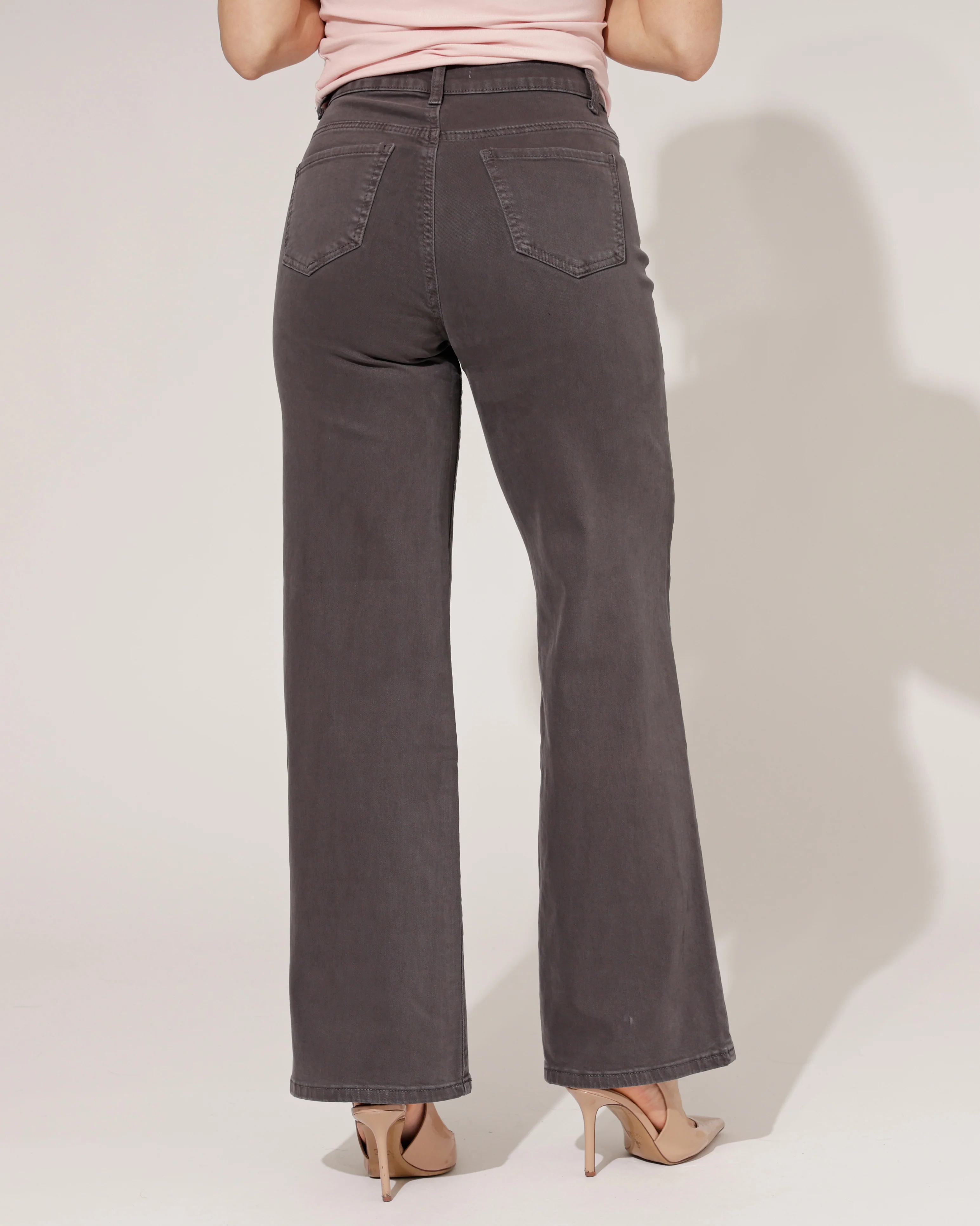 De Goodies Wide Leg Jeans Es-5 in donkergrijs is een high-waist model in super stretchy stof en een egale, diepe wassing. De brede pijpen geven een trendy look en de jeans is verkrijgbaar van maat 36 tot en met 48 — ideaal voor elke vrouw die houdt van comfort en een moderne fit.