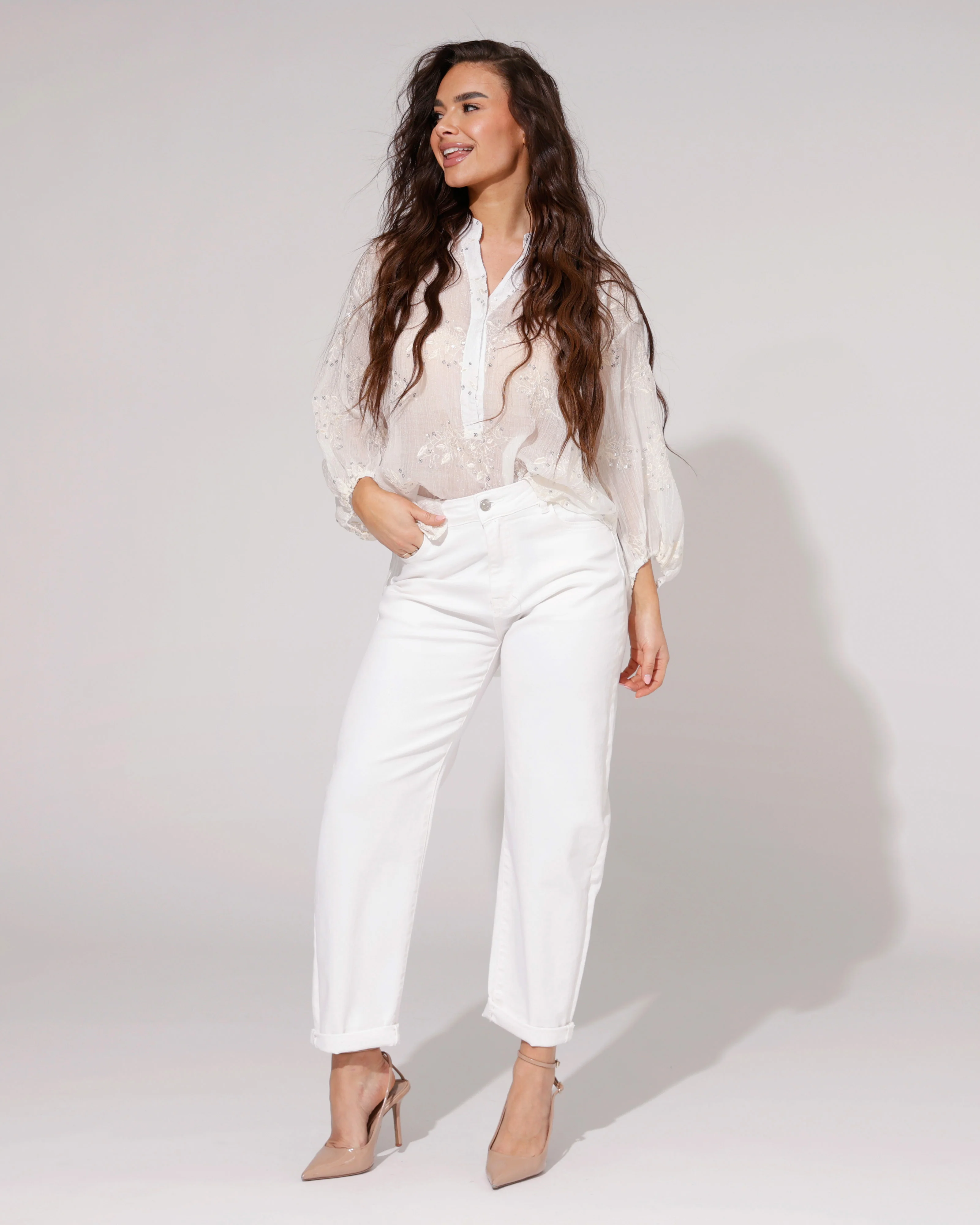 Trendy witte Hello Miss barrel jeans met een moderne barrel fit en zilverkleurige strass steentjes op de achterzakken. De broek zit comfortabel en geeft je outfit een frisse, opvallende look. Makkelijk te combineren met een top, trui of blazer. Een echte denim musthave voor je kledingkast.