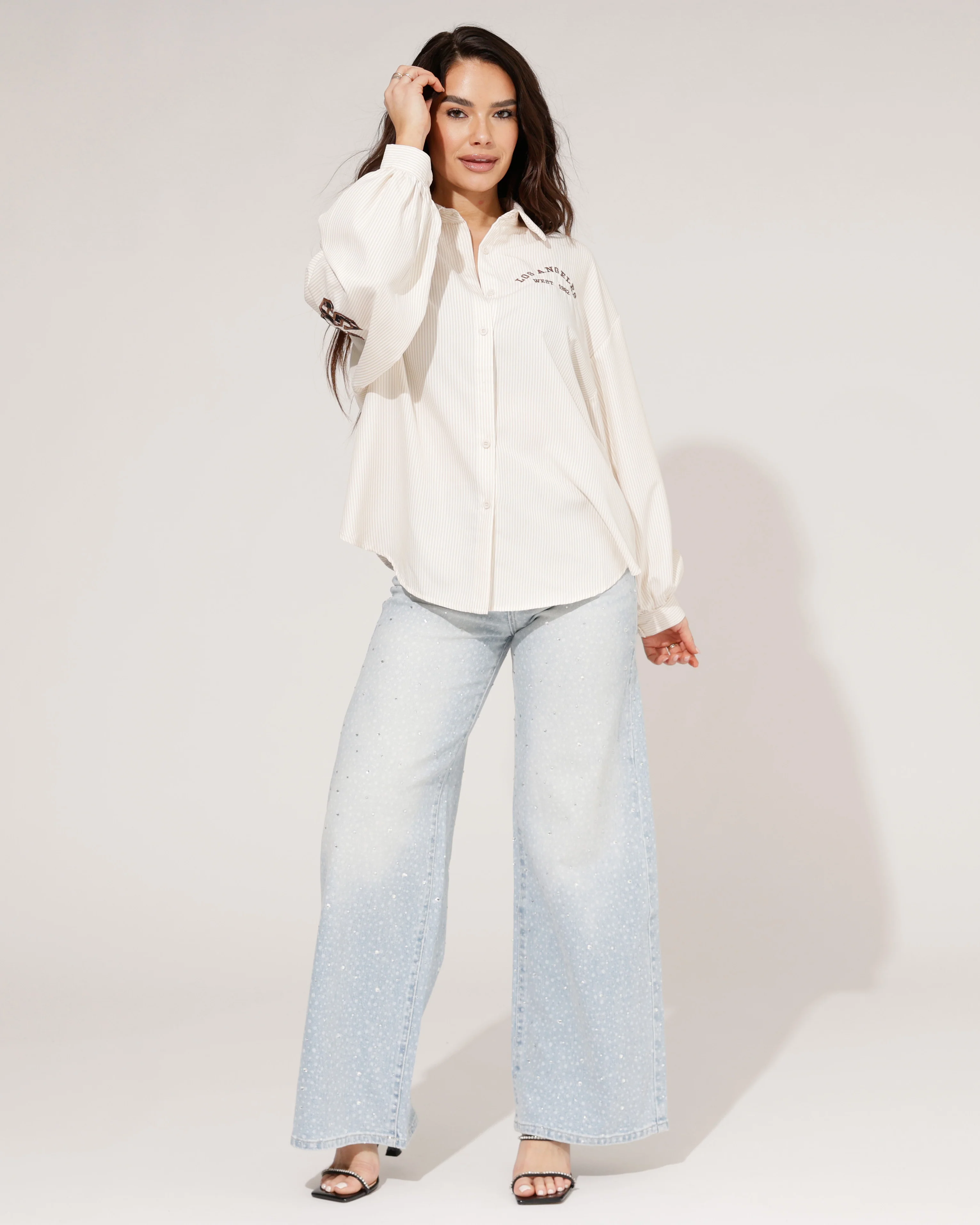 Deze Hello Miss wide leg jeans heeft een lichte denim wassing met een bijzondere punt print die doet denken aan een subtiele witte panterprint. De kleine stras steentjes geven de jeans een opvallende en trendy look. Een wide leg jeans die meteen opvalt en perfect past bij een stoere outfit.